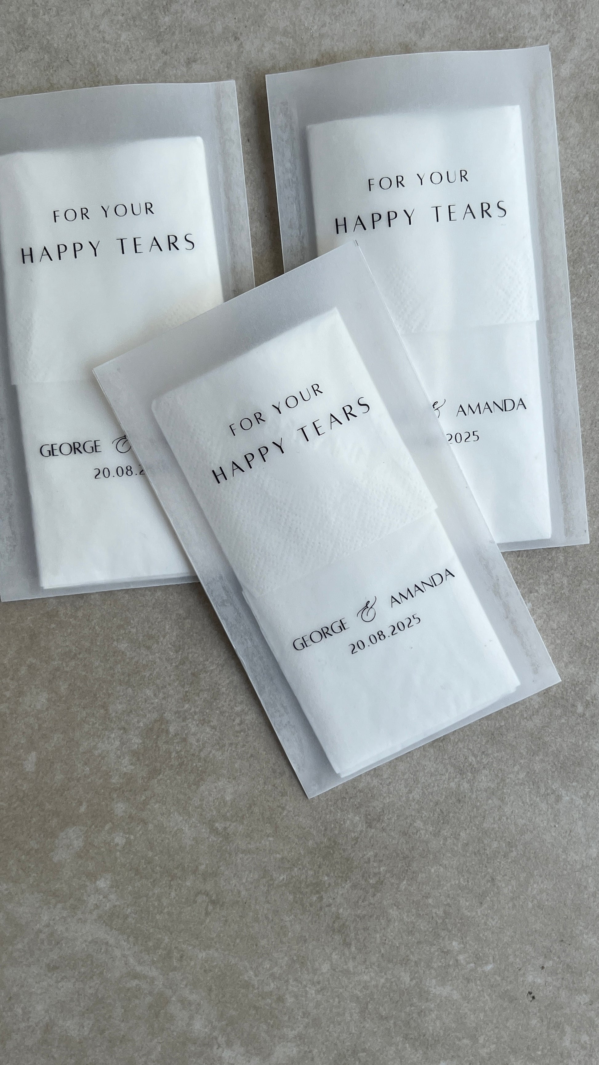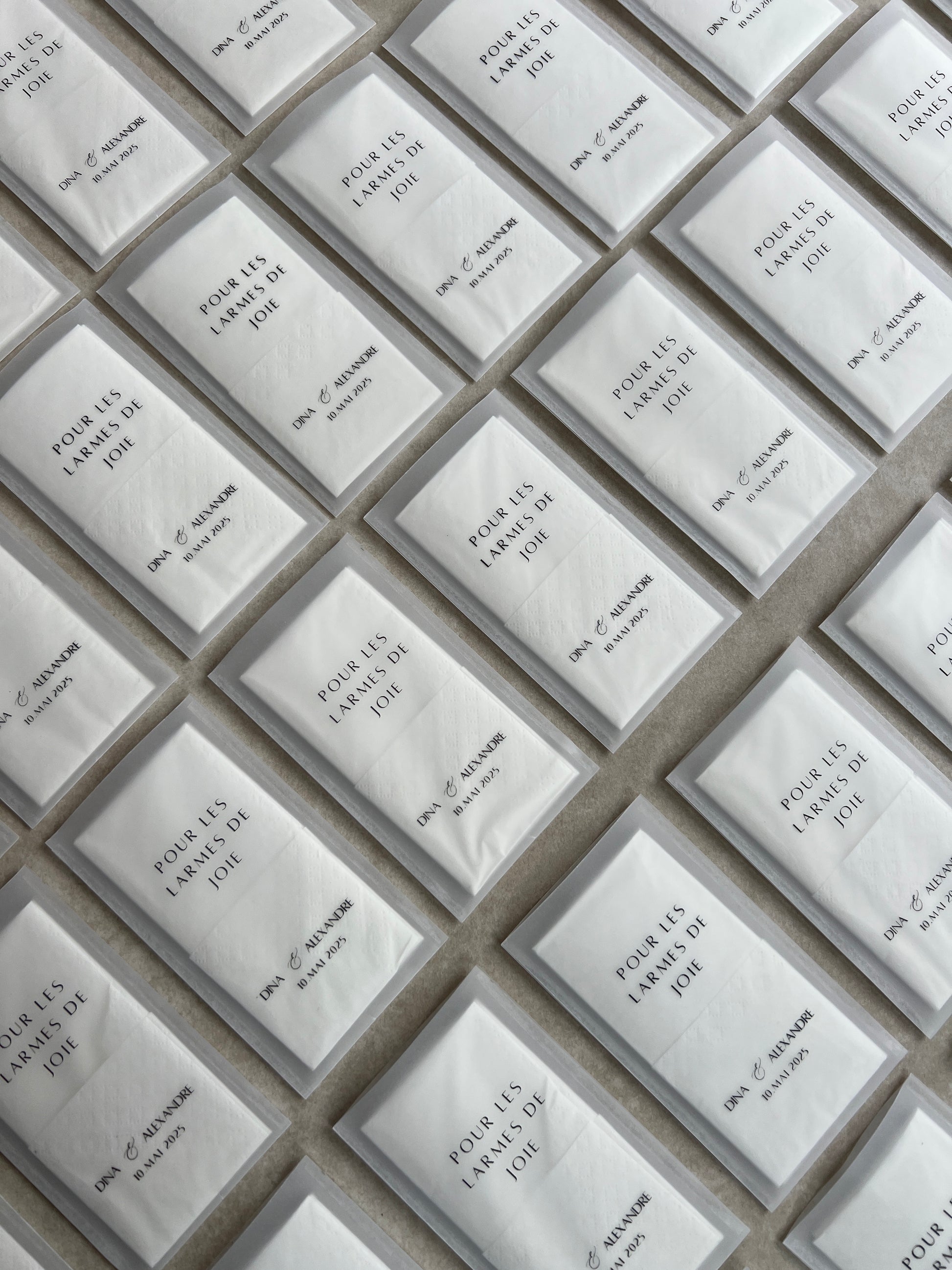 Rührt eure Gäste zu Tränen – und seid bestens darauf vorbereitet! Unsere liebevoll verpackten „Freudentränen“-Taschentücher sind in einer transparenten Hülle verpackt und können individuell mit euren Namen und dem Hochzeitsdatum gestaltet werden. 🌸